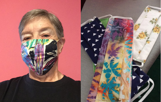 Cay Sullivan wearing one of her custom made masks and a few samples that she donates to Caritas Connections.